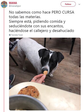"Siempre está, pidiendo comida y seduciéndote con sus encantos, haciéndose el callejero y desahuciado", describe, al tiempo que da cuenta de que con su afilado modus operandi, "Perro Vaca" habría logrado engañar a las personas más preparadas de esa casa de altos estudios.