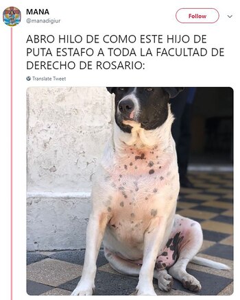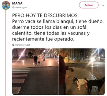 Tras el repaso pormenorizado del accionar de "Perro Vaca", @manadigiur, que en realidad se llama Mariana, reveló el secreto qué generó cientos de réplicas de damnificados en Twitter: "Perro vaca se llama Blanqui, tiene dueño, duerme todos los días en un sofá calentito, tiene todas las vacunas y recientemente fue operado".