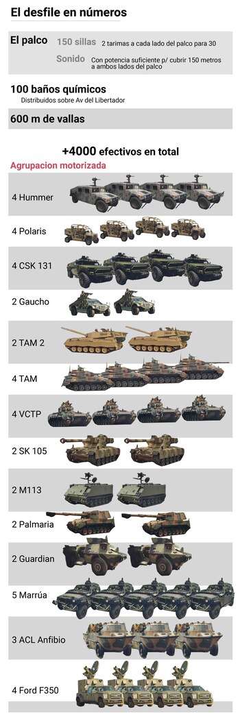 Además serán parte de la muestra vehículos militares de operaciones y logística (2 Guardian, 5 Marrúa, 4 Ford F350 y 3 ACL 5 Anfibios) y de combate como los M-113 (2), SK-105 (2), VCA Palmaria (2) y los tanques TAM y TAM II (4) y VCTP (2).