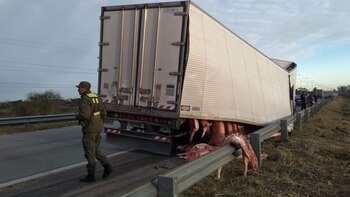 Algunos vecinos de La Guardia sintieron el impacto. Otros corrieron rápidamente hacia la Ruta Nacional 168, alertados por el rumor. El hecho del que todos hablan en Santa Fe ocurrió cerca de las 8 de la mañana, cuando un camión que transportaba unas 450 medias reses de cerdo perdió el control, se desfondó y entregó una imagen que se viralizó rápidamente por las redes sociales: decenas de personas llevándose los cerdos, cargándolos en sus hombros o arrastrándolos sobre el pavimento.