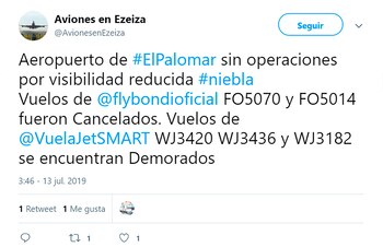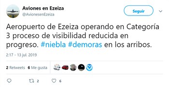Mientras que el aeropuerto de Ezeiza está operando en "categoría 3", con proceso de visibilidad reducida en progreso; algunos de los vuelos fueron desviados a otros destinos para concretar los aterrizajes.