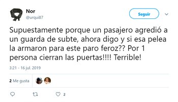 Miguel Benítez, delegado de la UTA en la línea D, justificó los motivos en diálogo con radio La Red: "Tenemos compañeros agredidos; tenemos chicas de licencia porque las golpearon y no hay personal policial en ninguna de las estaciones. Tienen 33 policías para todas las líneas de subte, no hay manera de cubrirlas así. Queremos seguridad para trabajar tranquilos".