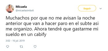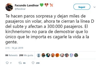 En declaraciones a Radio Mitre, Felipe Miguel, jefe de Gabinete porteño, refutó el argumento de los sindicalistas y aseguró que independientemente de la razón, es inadmisible una huelga que afecta a tanta gente. "No compartimos el argumento, no es aceptable que de manera intempestiva afecten de esta manera la vida de la gente y sin aviso", enfatizó.