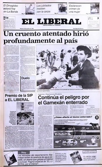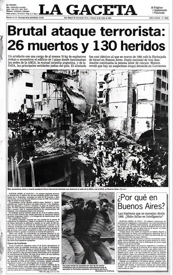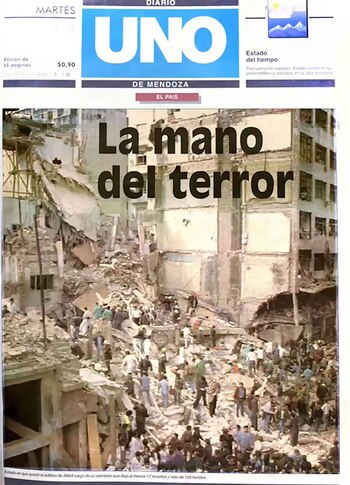 Pero luego, realizó una extensa bajada donde detallaba: "Un atentado contra la sede la Asocicación Mutual Israelita Argentina provocó la muerte de unas 30 personas y heridas a unas 150. El acto terrorista se habría consumado con una bomba colocada en un auto. Se utilizaron no menos de 70 kilos de explosivos". Debajo de la foto, se mostraba otro título: "Un comando islámico se atribuyó la autoría".