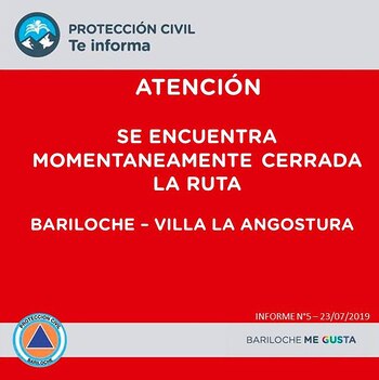 Como consecuencia del accidente en el camino de los Siete Lagos, por el que murió una turista chilena y hay siete heridos, Vialidad Nacional informó que, hasta nuevo aviso, permanecerá intransitable para todo tipo de vehículos la ruta 40, desde el Empalme con la ruta provincial 63 (Villa Meliquina) hasta el empalme con la ruta nacional 231.