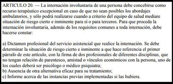 El Artículo 20° contempla la internación involuntaria, aunque esta queda sujeta a una serie de condiciones que deben darse para hacerla posible. La norma se apoya en el supuesto de que internar a un paciente contra su voluntad, atenta directamente contra los Derechos Humanos del individuo.