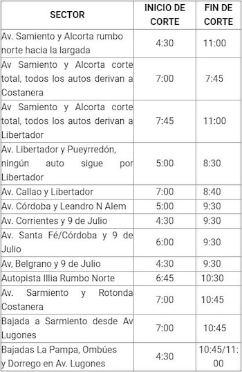 A continuación, los lugares y los horarios de los cortes en detalle.