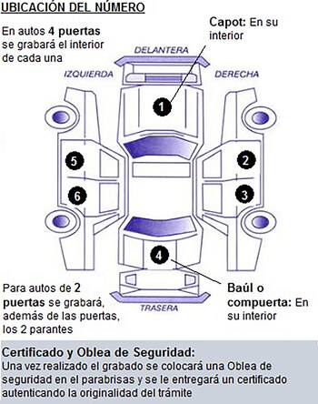 El grabado de autopartes consiste en identificar con el número de patente en el capot, las puertas y el baúl. El procedimiento es solicitado en los registros automotores y las compañías de seguro.