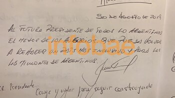 Fue así que Fernández firmó una curiosa dedicatoria, que se convertirá en un mensaje para él mismo si el 27 de octubre confirma los resultados de las PASO: “Al futuro presidente de todos los argentinos, el mejor de los augurios. Que pueda volver a rehacer un país más inclusivo y para los 45 millones de argentinos”.