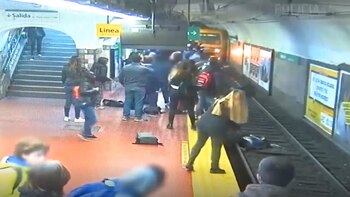 El hecho se produjo alrededor de las 11 del martes y quedó registrado en las cámaras de seguridad de la estación. En las imágenes se observa al hombre apoyado contra una columna cuando de pronto se desvanece y cae de frente al suelo, empujando con el envión a la mujer, que caminaba por al lado suyo en el andén.