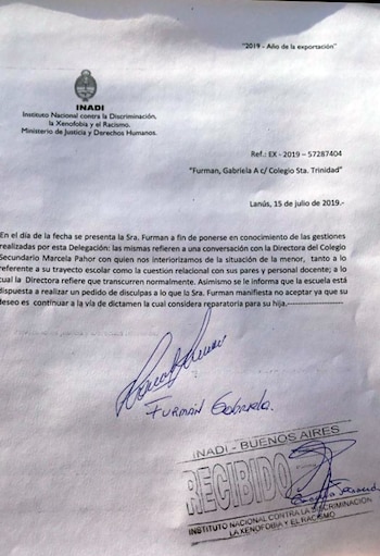 Furman espera el dictamen del INADI por ambas denuncias, el cual será sumado a las causas penales y civiles iniciadas contra la institución. “Mi hija estuvo un mes sin ir al comedor porque la miraban. Lo descubrí cuando vi que bajó de peso y me reconoció que hacía 30 días no almorzaba. Todo por algo que no pasó. El lunes voy a volver al colegio para reclamar y hablar con las autoridades. Esto no va a quedar así”.