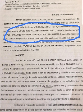 Infobae constató que tal acusación se ve reflejada en la hoja n°15 del descargo presentado por la escuela, el cual se incorporó en el expediente. “Me siguen hombres en redes sociales. Me mandan videos porno, me preguntan cuánto cobro. Tuve que volver al psicólogo y al psiquiatra, con los que ya lidié en aquel momento", expresó Furman. La doctora Andrea Casaux, en representación del colegio, solicitó “que se rechace la denuncia formulada por Gabriela Alejandra Furman por resultar inexacta, carente de pruebas y, en definitiva, por no acreditarse conducta alguna que infrinja la ley 23.592″.