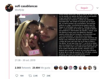 “Irreal. Lo único que puedo decir en este momento. Esta fue la ultima foto que nos sacamos juntos. Siento que de un momento a otro mi otra mitad estaba destruida. Tengo el placer de decir que no me quedé con ganas de nada, que no nos quedó ningún pendiente. Como siempre el amor predominaba en nosotros y jamás fue necesario recordárnoslo. Me rompe el corazón que te hayas ido, no tanto porque voy a extrañarte, sino porque todavía no caigo. Constantemente espero que me llegue un WhatsApp tuyo y sea un 'buenas noches, mor’ y que puedas ver lo lindo que quedó el disfraz. Que podamos ir disfrazados de Sasuke y Naruto. Que nos demos el amor que nos dábamos siempre”, redactó.