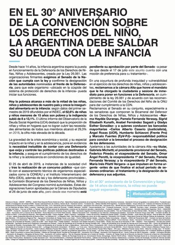 En una coyuntura de profunda inequidad y vulnerabilidad en el ejercicio de los derechos de niñas, niños y adolescentes, reclamamos a la cámara Alta que honre el mandato que le ha otorgado la ciudadanía y sesione de inmediato para poner en funciones a la Defensoría, en cumplimiento de la ley 26.061 y de acuerdo con las recomendaciones del Comité de los Derechos del Niño de la ONU para dar cumplimiento a la CDN.
