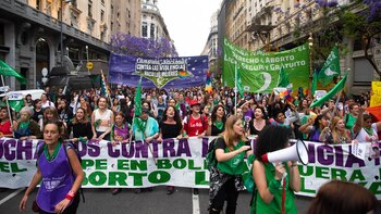 Los reclamos por el aborto legal en Argentina se mezclaron con consignas como “Chile despertó” y con cánticos contrarios a Jeanine Áñez, la presidenta interina de Bolivia. La marcha de esta tarde parecía contener varias marchas en su interior: la bandera verde la Campaña por el Aborto Legal, Seguro y Gratuito estaba junto a la bandera de Bolivia, y la que representa a la comunidad LGTBIQ se mezcló con la whipala, ambas muy coloridas.