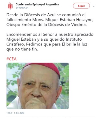 “Desde la Diócesis de Azul se comunicó el fallecimiento de monseñor Miguel Esteban Hesayne, Obispo Emérito de la Diócesis de Viedma. Encomendemos al Señor a nuestro apreciado Miguel Esteban y a su querido Instituto Cristífero. Pedimos que para Él brille la luz que no tiene fin”.