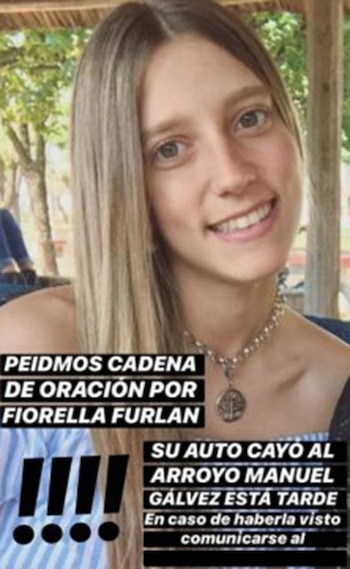 “Estamos desesperados! Es mi hermana Fiorella. Su auto cayó a un arroyo hace horas y no sabemos nada de ella. No la encuentran. Por favor compartan su foto por si alguien sabe algo”, posteó su hermana Flavia en redes sociales. La familia hasta este sábado ponía sus esperanzas en que la joven “esté desorientada en algún lugar” tras lo sucedido.