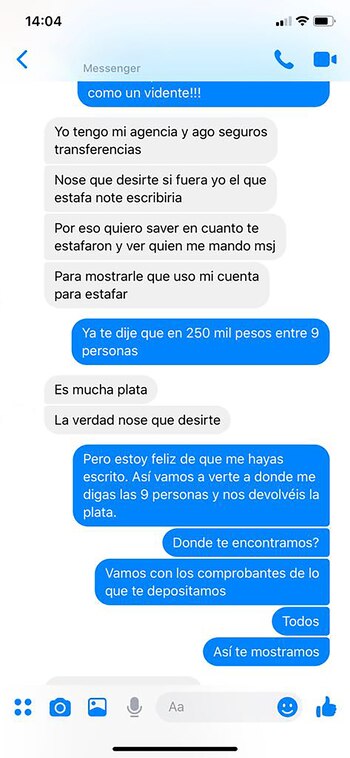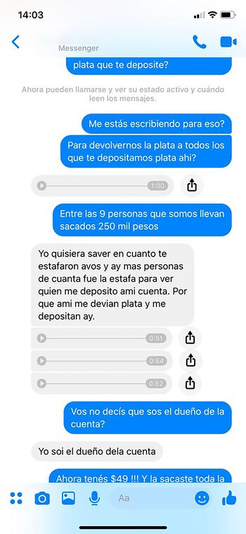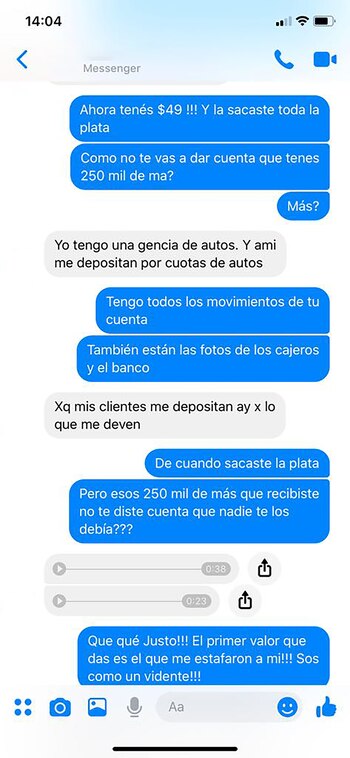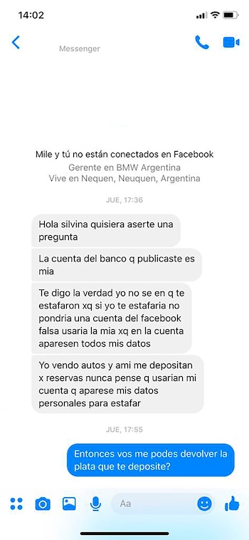 En un nuevo diálogo con Infobae, Silvina contó que además de la denuncia en la comisaría de Monte Hermoso, acudió a la Superintendencia de Delitos Económicos de Neuquén, a la AFIP e incluso al banco donde pertenece la cuenta a la que transfirieron el dinero, para exponer lo que había sufrido y que tomen cartas en el asunto. Esto hizo que apenas días después, Castillo -supuesto hermano de la locadora con la que hicieron el trato- la contactara por Facebook. En el intercambio de mensajes (de texto y audio) el hombre increíblemente le asegura que jamás se percató de que en su cuenta hubiera un importante excedente de dinero. “Te digo la verdad, yo no sé nada. Yo vendo autos, a mí me deben una plata y paso mi número de cuenta. Si yo fuera un estafador no usaría mi número de cuenta con el mi DNI y mis datos en el banco. Por eso te pegunto en cuánto te estafaron para revisar mis mensajes. Habrán hecho alguna estafa para salvar sus cuentas o habrán hecho algo, pero no tengo idea de nada. Te pido mil perdones”, fue uno de los mensajes de Castillo.
