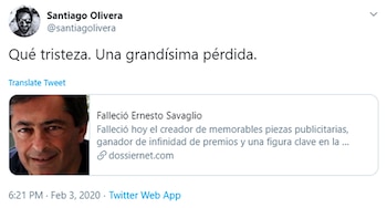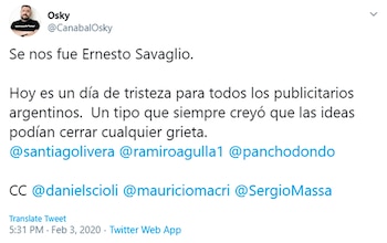 Importantes personalidades del mundo de la publicidad despidieron con afecto a Savaglio. Uno de ellos fue Osky Fernández: “Se nos fue Ernesto Savaglio. Hoy es un día de tristeza para todos los publicitarios argentinos. Un tipo que siempre creyó que las ideas podían cerrar cualquier grieta”.