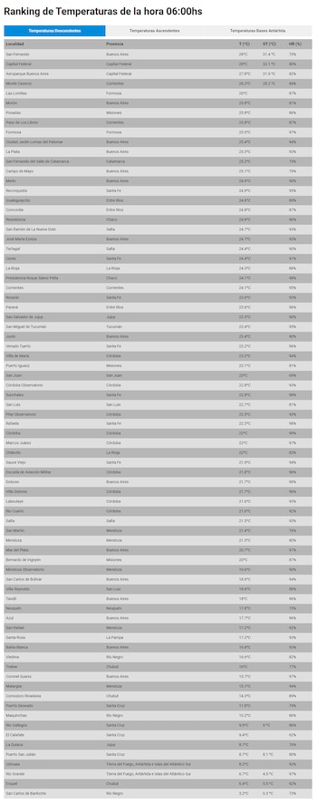 En el reporte de las 6 de la mañana, el SMN informó que la sensación térmica superó los 32 grados, algo que ubicó a la Capital Federal en el podio del ranking de temperaturas por ciudades. Incluso, a las 10, la térmica llegó a 35,8 grados.