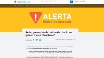 Frente a ello, la ANMAT recomienda “a los consumidores que hayan comprado o tengan en su poder el producto del lote mencionado, que se abstengan de consumirlo” y que “no lo abran ni lo prueben” y “a quienes expendan el producto, que cesen la comercialización de ese lote”.
