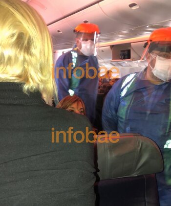 Alrededor de las 11.30 horas personal sanitario de frontera especializado subió a la aeronave con guantes, barbijos y antiparras para hacer los controles. Y mientras unos asistían al paciente con fiebre, que es de nacionalidad argentino, otros le medían la fiebre a las personas que estaban a su alrededor. “Utilizan una especie de dispositivos láser que se colocan en la frente de las personas y marcan la temperatura corporal”, contó a Infobae otro de los pasajeros del vuelo.