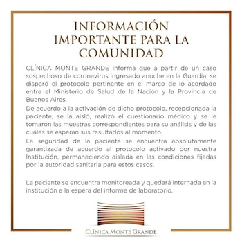 “De acuerdo a la activación del protocolo, recepcionada la paciente, se la aisló, realizó el cuestionario médico y se le tomaron las muestras correspondientes para su análisis y de las cuáles se esperan sus resultados”, informó la clínica Monte Grande sobre la mujer, que vive en Lomas de Zamora.