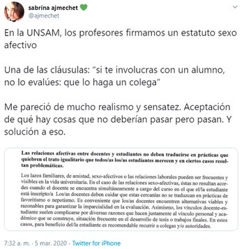 Sabrina Ajmechet, docente de historia y coordinadora de la Maestría en Políticas Públicas, fue una de las que se mostró a favor de la iniciativa. “En la UNSAM, los profesores firmamos un estatuto sexoafectivo. Una de las cláusulas: “Si te involucras con un alumno, no lo evalúes: que lo haga un colega”. Me pareció de mucho realismo y sensatez. Aceptación de que hay cosas que no deberían pasar pero pasan. Y solución a eso”, tuiteó.