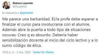Pero las críticas no tardaron en llegar y muchos de sus colegas opinaron que se trata de una medida disparatada. “Me parece una barbaridad. El/la profe debe esperar a finalizar el curso para involucrarse con el alumne. Además abre la puerta a todo tipo de situaciones oscuras. Creo que es absurdo. Debería haber sensibilización docente al inicio del ciclo lectivo y a lo sumo código de ética”, le respondió Débora Lopreite, politóloga y profesora de Género, Política y Políticas Públicas de la UBA.