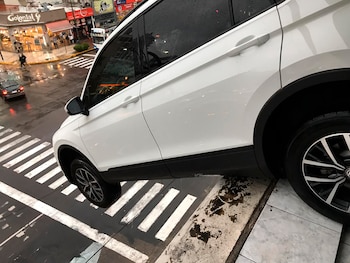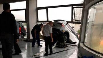 Sin embargo, en una mala maniobra perdió el control y siguió de largo, atravesando el cristal. Más de la mitad del auto quedó a la intemperie. Y el conductor, claro, atrapado allí adentro. No cayó al vacío porque la parte trasera quedó trabada.