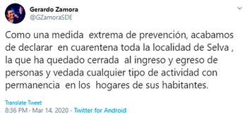 Ante la situación, las autoridades de Selva decidieron poner en cuarentena a toda la localidad. Lo anunció el Comité de Emergencia en una Conferencia de Prensa que se transmitió vía Facebook. Además, el Gobernador de Santiago del Estero confirmó la información desde su cuenta de Twitter.