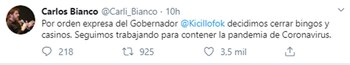 “Por orden expresa del Gobernador @Kicillofok decidimos cerrar bingos y casinos. Seguimos trabajando para contener la pandemia de Coronavirus”, aseguró Bianco en su cuenta de Twitter.