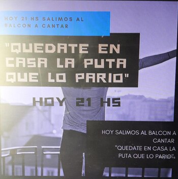 En Argentina también, además de los aplausos coordinados a los médicos, enfermeros y todo el personal sanitario, se organizó un canto común para promover la cuarentena. En lenguaje bien callejero -incluyendo una mala palabra para reforzar el mensaje-, el texto que circulaba en las redes sociales decía: “Hoy Sábado 21hs, el país entero desde sus ventanas, balcones, terrazas, desde todas las casas del país, cantaremos #quedateencasalaputaqueteparió, en contra de aquellos que desoyendo la voz del Presidente y poniendo en riesgo a toda la sociedad, siguen circulando libremente sin respetar la cuarentena. Argentina Unida para salir adelante y vencer al coronavirus. ¡Pasalo a todos tus contactos!”