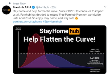 “Quedate en casa y ayudá a achatar la curva! Como el coronavirus sigue impactándonos a todos, Pornhub decidió extender el contenido premium libre a nivel mundial hasta el 23 de abril. Disfrutá, quedate en casa y mantenete a seguro”, publicó la empresaen su cuenta oficial de Twitter.