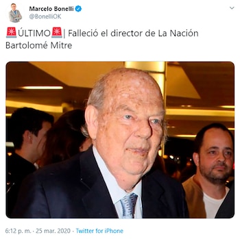 “Muy triste por la partida de Bartolomé Mitre. Pocos defendieron tanto la libertad de prensa como él. Un abrazo en este momento difícil para Esmeralda, Nequi (Gallotti, su mujer), y en especial para vos Dolores Mitre”, apuntó desde su cuenta de Twitter el Secretario de transporte y obras publicas de la Ciudad de Buenos Aires, Juanjo Méndez. Pasadas las 19.30 hs, la ex Gobernadora de la Provincia de Buenos Aires, María Eugenia Vidal se sumó a la despedida. ″Lamento mucho la partida de Bartolomé. Un abrazo enorme a Dolores Mitre, su familia y cercanos en este difícil momento", sostuvo.