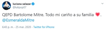 Otra que alzó la voz fue Luciana Salazar. La rubia se hizo eco de los mensajes y escribió: “Que en paz descanses Bartolomé Mitre. Todo mi cariño a su familia”. A ella se sumaron periodistas y conductores de noticieros como Cristina Pérez y Marcelo Bonelli, que aprovecharon para viralizar la noticia del deceso.
