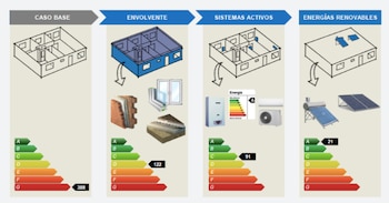 Algunas de las cuestiones que mide la etiqueta son las instalaciones de calefacción, refrigeración, agua caliente sanitaria, iluminación, y producción de energías renovables, aportes y pérdidas térmicas, transmitancia térmica de paredes, cubierta, solado y aberturas, exposición a la intemperie, nivel de infiltraciones, etc.