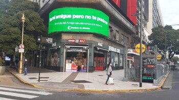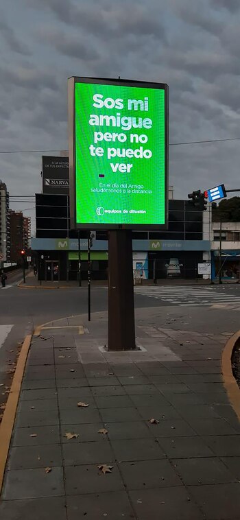 “Sos mi amigue pero no te puedo ver. En el Día del Amigo saludémonos a la distancia”, dicen los mensajes que poblaron la escena del Área Metropolitana de Buenos Aires. Ocupan las pantallas de los ingresos a los municipios y los carteles digitales que se erigen en las principales esquinas porteñas. Hace alusión a las celebraciones del Día del Amigo en el marco de la cuarentena y las normas de restricción de los encuentros. El mensaje se refiere a evitar las reuniones entre amigos, en línea con las recomendaciones del presidente Alberto Fernández y el grupo de epidemiólogos que lo asesoran.