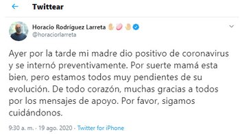El jefe de Gobierno, a través de un tuit, expresó: “Ayer por la tarde mi madre dio positivo de coronavirus y se internó preventivamente. Por suerte mamá esta bien, pero estamos todos muy pendientes de su evolución. De todo corazón, muchas gracias a todos por los mensajes de apoyo. Por favor, sigamos cuidándonos”.