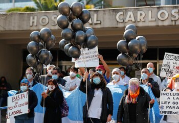 En el día de ayer, los trabajadores del Hospital Durand realizaron una suelta de globos negros en la puerta de la institución para rendir homenaje a los enfermeros de ese centro médico fallecidos por coronavirus. También exigieron mejoras en sus condiciones laborales y en sus salarios.
