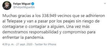 “Muchas gracias a los 338.949 vecinos que se adhirieron al Telepase y van a pasar por los peajes sin riesgo de contagiarse o contagiar a alguien. Una vez más demostramos responsabilidad y compromiso para enfrentar la pandemia”, aseguró Felipe Miguel, jefe de Gabinete porteño.