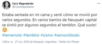 El temblor generó decenas de comentarios en las redes sociales: “Estaba sentada en mi cama y sentí cómo se movió por varios segundos. En varios barrios de Neuquén capital se sintió por algunos segundos el temblor. Qué susto!”, puiblicó una vecina de Neuquén capital.