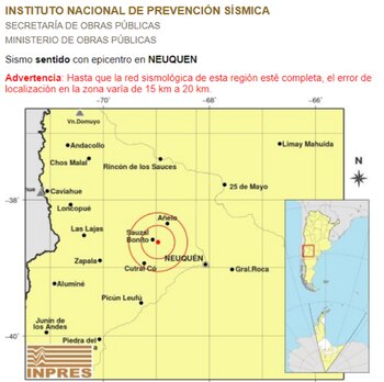 Hasta el momento no se reportaron víctimas fatales ni daños materiales de importancia. También informaron que se sintió en algunas localidades de Río Negro como Cipolletti y Roca.