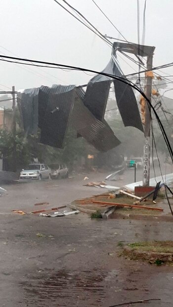 En uno de los videos viralizados se puede observar la voladura de un techo en el Motel Caldén, sobre la Ruta Nacional 35, en uno de los ingresos a la ciudad a la ciudad de Santa Rosa. También cayeron muchos árboles sobre las rutas. En la Avenida Perón de la capital pampeana quedaron muchos ejemplares que no resistieron el vendaval y en el barrio Lowo Ché algunos árboles cayeron sobre las viviendas y arrastraron postes y cables, lo que provocó el corte de la energía eléctrica.