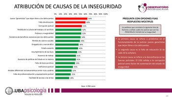 A la hora de encontrar los motivos por los cuales se incrementaron los hechos de seguridad en una encuesta con opciones fijas múltiples, la mayoría de los encuestados, un 64%, consideró que se debe a “los jueces garantistas que dejan ibres a los delincuentes”, mientras que un 60% eligió la opción “falta de educación” y un 53%, la “corrupción policial”.