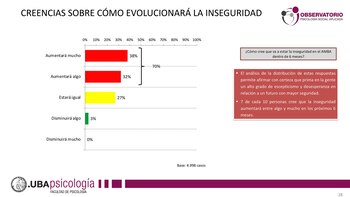 Siete de cada diez de los encuestados consideró que la inseguridad en el AMBA va a aumentar en el período de los próximos 6 meses. Un 32% indicó que los delitos “aumentarán algo”, mientras que un 38% pronosticó que “aumentarán mucho”.