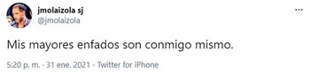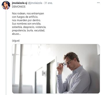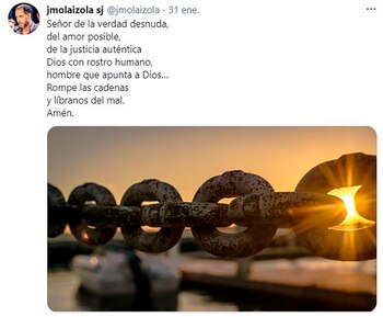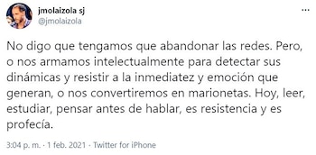 — Su actividad en las redes es incesante y tan distintiva. Usted es crítico de esos espacios y sin embargo sobrevive allí con el éxito de un youtuber. Y en Twitter (@jmolaizola) ha logrado instalar un estilo “haiku” absolutamente adaptado a la lógica de la red del pajarito. ¿Cómo es su relación con y en las redes sociales? ¿Es posible orar en Twitter, el espacio más amado por los odiadores seriales y los crueles trolls? Copio uno de sus tuits: “Señor de la verdad desnuda, del amor posible, de la justicia auténtica Dios con rostro humano, hombre que apunta a Dios… Rompe las cadenas y líbranos del mal. Amén”