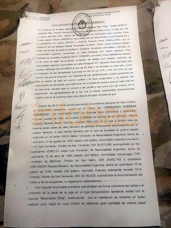 Todo sucedió el sábado por la mañana, cuando una camioneta marca Peugeot circulaba por la localidad bonaerense de Pilar. En el interior se encontraban tres jóvenes militantes del Movimiento Evita, que se dirigían a la Basílica de Luján, con el objetivo de presenciar el acto que se realizó allí por los ocho años del pontificado del papa Francisco. Las banderas de caña que sobresalían de las ventanas llamaron la atención de los oficiales de Gendarmería, quienes pidieron al conductor que se detuviera y procedieron a revisar el vehículo.
