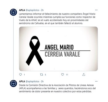 “Lamentamos informar el fallecimiento de nuestro compañero Ángel Mario Cerreia Varale ocurrido mientras cumplía sus funciones como Inspector de Vuelo de la ANAC en el vuelo accidentado hoy en proximidades del aeródromo de Cañuelas, en el que también falleció el alumno. Acompañamos a las familias y seres queridos, haciéndonos eco del sentimiento de dolor presente en nuestro colectivo por estas pérdidas”, manifestaron a través de las redes sociales.