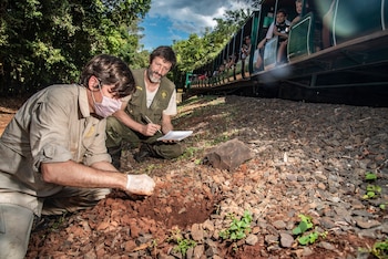 Atilio Guzmán, biólogo del CIES (Centro de Investigación Ecológica Subtropical), trabaja en un proyecto junto a la Administración de Parque Nacionales y el Ministerio de Ambiente y Desarrollo Sustentable de la Nación para estudiar la población, y le contó a Infobae que surgió cuando empezaron a notar que las tortugas anidaban al costado de las vías del trencito que va a la Garganta del Diablo. Allí, en épocas donde los turistas llegan al parque, la gente alimenta a los coatíes y les tira alimento. Entonces cuando estos mamíferos buscan su comida, arrasaban también con los nidos.